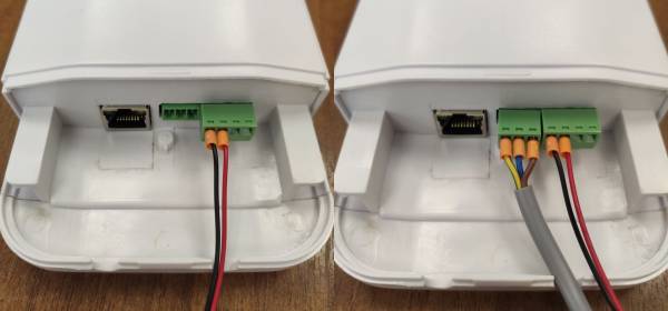 Расположение кнопки. Кнопку аварийного останова требуется разместить в доступном месте на высоте около 1,5 метра таким образом, чтобы кабель кнопки после укладки доставал до антенны. Кнопка имеет герметичное исполнение и может устанавливаться, как и антенна, под открытым небом. Перед укладкой кабеля и сворачивания его излишков в моток рекомендуется его подключить к антенне: зеленый трёхконтактный разъем надо подключить в зелёную колодку между колодкой индикатора работы и разъемом LAN, как показано на фото (до и после подключения):