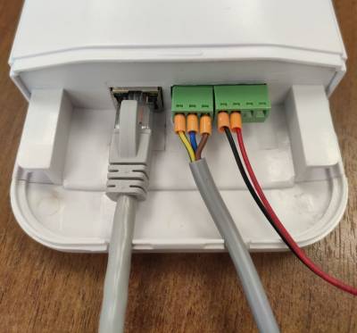Комплектный кабель LAN (патч-корд) одним концом подключается к розетке роутера (или коммутатора локальной сети), другим концом подключается в разъем «LAN» блока питания. Из блока питания с разъема с маркировкой «POE» должен выйти кабель Ethernet (витая пара) к антенне. К антенне этот кабель подводится к единственному разъему, как показано на фото: