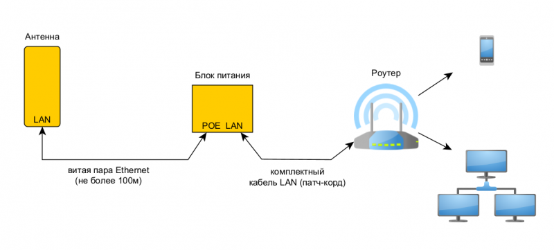 Подключение питания Антенна получает питание по кабелю Ethernet (компьютерная витая пара), по этому же кабелю антенна подключается в локальную сеть или к роутеру. Подмешивание питания (инжектирование) в кабель происходит в комплектном источнике питания, схема подключения выглядит следующим образом: