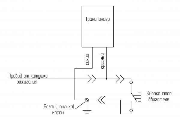 Транспондер подключается красным проводом в разрыв провода кнопки, синий провод транспондера подключается на массу. После подключения транспондера в разрыв кнопки стоп двигателя должна получиться следующая схема: