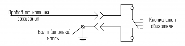 Подключение к двигателям с катушкой старого образца используется провод кнопки стоп двигателя. Исходная схема подключения кнопки стоп двигателя выглядит так: