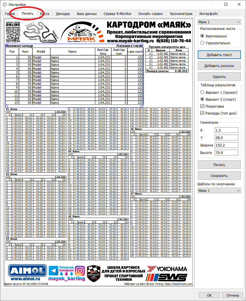 Затем выберите вариант таблицы результатов и необходимость печати всех кругов и таблицы рекордов дня. Разместите элементы на листе по вашему желанию, для этого выберите мышью нужный элемент и передвиньте его в желаемую позицию. Размер элемента печати можно изменить потянув за маркеры в углах рамки.