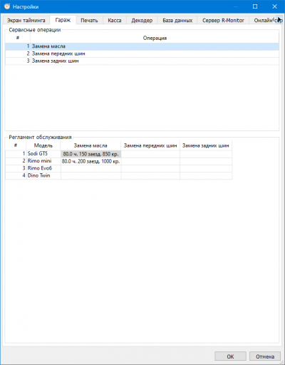 Перед началом использования, настройте необходимые параметры модуля - перечень сервисных операций и параметры наработки для автоматического отслеживания. Откройте раздел настроек - пункт меню «Администрирование-Настройки», введите пароль от настроек программы (по умолчанию - 2016). Выберете вкладку «Гараж».