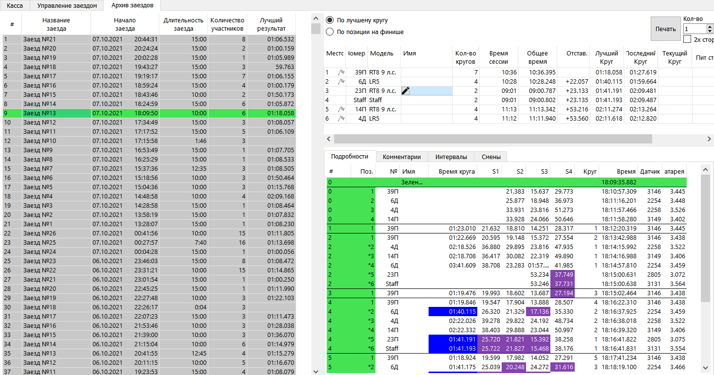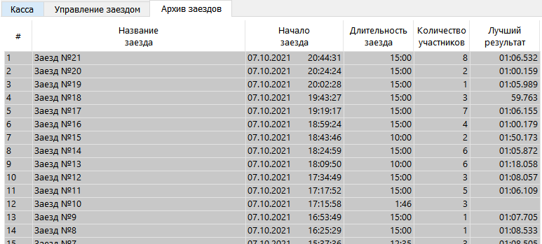 Каждый заезд после завершения сохраняется в базу данных программы и доступен к загрузке и просмотру. Для перехода в списку архивных заездов откройте вкладу «Архив заездов»